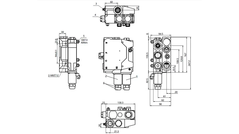 - Diseño modular y compacto que puede combinarse con válvulas multicarrete para un control hidráulico integrado.